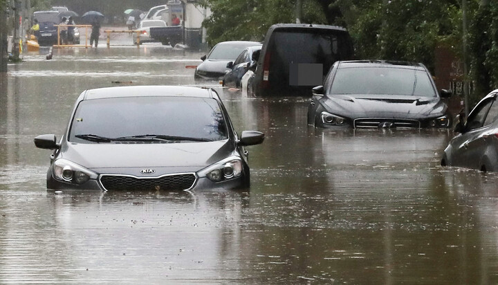 "침수된 도로에서는 절대 진입 금지입니다. 차량을 버리고 즉시 대피하세요."