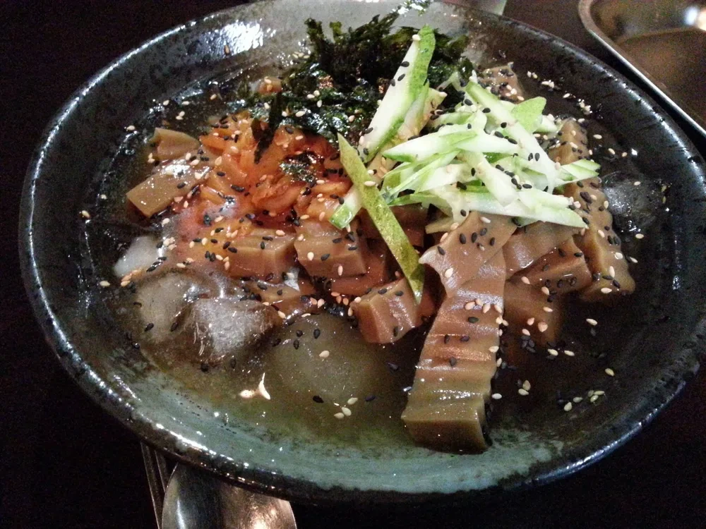 묵사발에서 육수는 국물 맛을 결정짓는 매우 핵심적인 요소입니다. 냉면 육수를 활용하는 것이 한 가지 방법입니다.