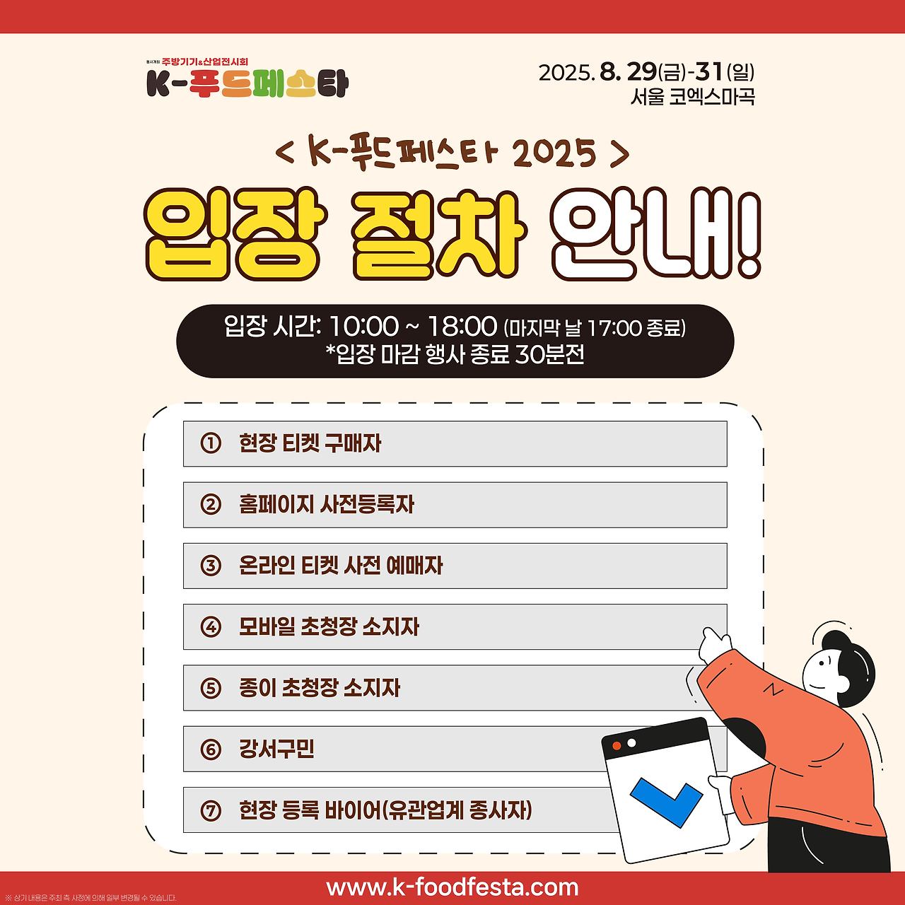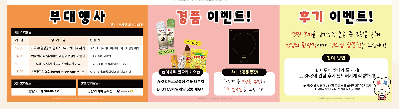 마지막 날인 8월 31일(일), K-Food Festa는 오후 5시까지 열립니다. 행사 종료 30분 전인 오후 4시 30분부터는 입장이 불가하므로 사전등록을 통해 미리 시간을 계획하는 것이 좋습니다. 이처럼 시간 관리가 중요한 만큼, 시간 내에 행사장을 둘러보시길 권장합니다.