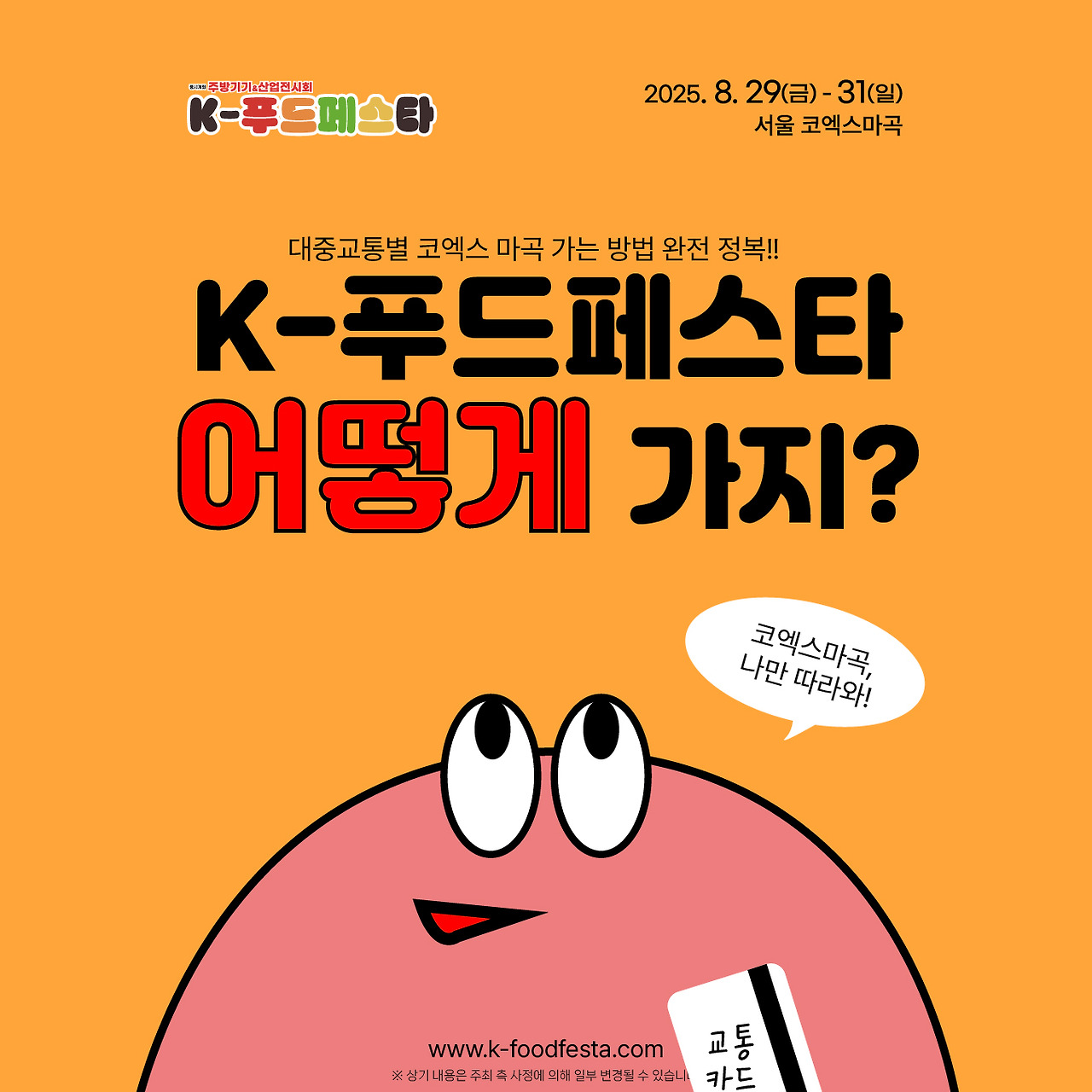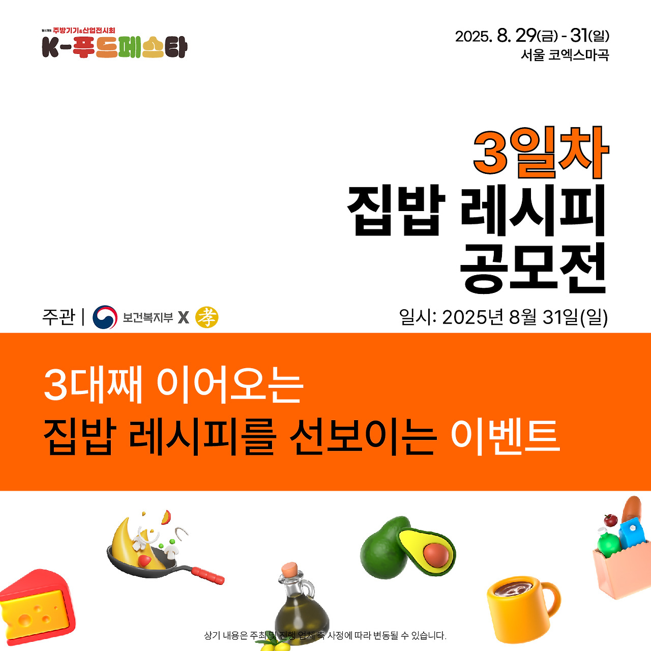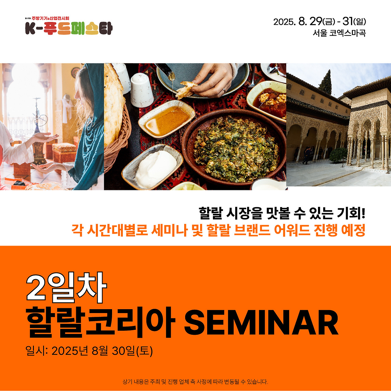 2025년 8월 29일(금)부터 31일(일)까지, 서울 코엑스에서 K-Food Festa가 개최됩니다. 행사 시간은 매일 오전 10시부터 오후 6시까지이며, 마지막 날인 8월 31일(일)은 오후 5시까지 진행됩니다. 행사 종료 30분 전에는 입장이 마감되므로 참고하시기 바랍니다.